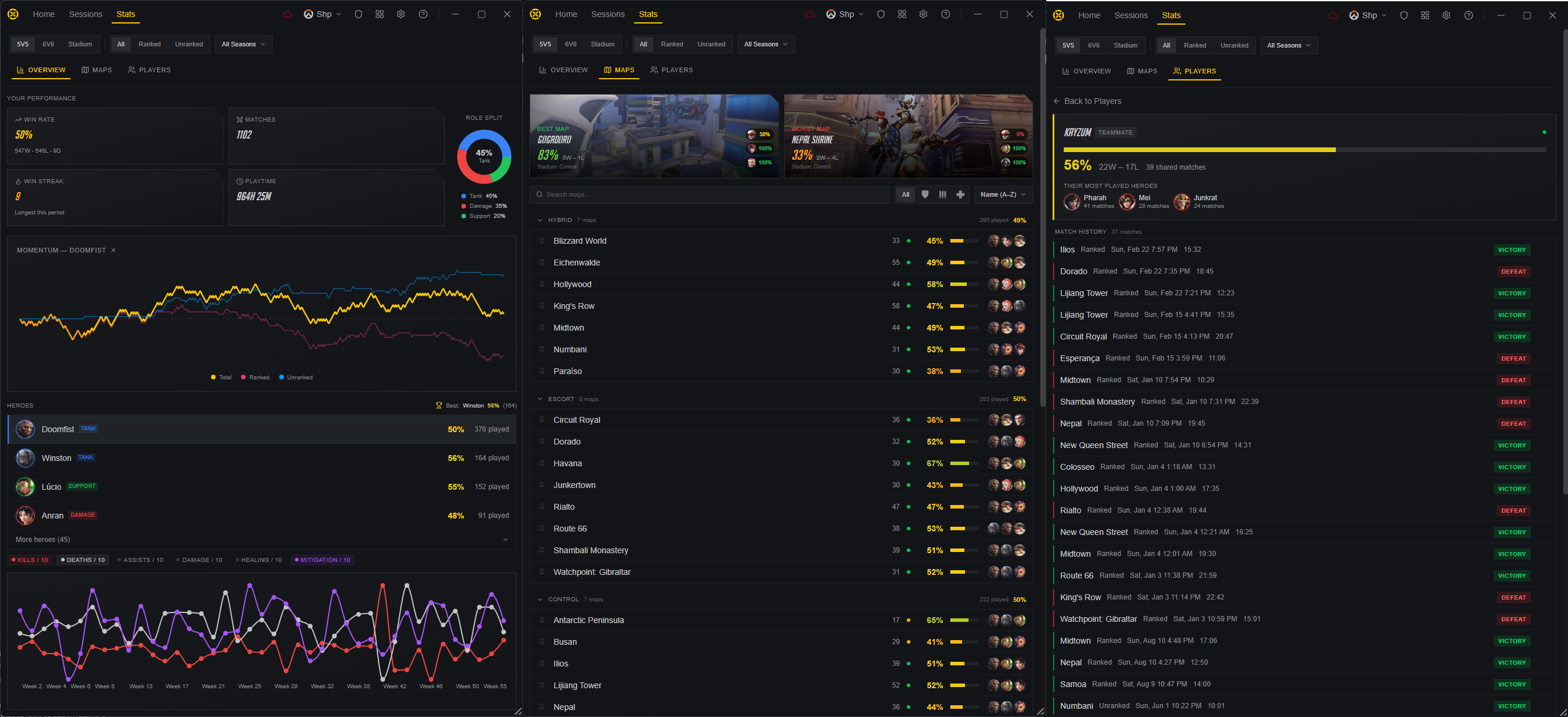 - Map Performance Tab: Browse every map grouped by type (Hybrid, Escort, Control, etc.) with win rates, games played, and your most-played heroes per map. Filter by role or specific hero, and search for any map by name