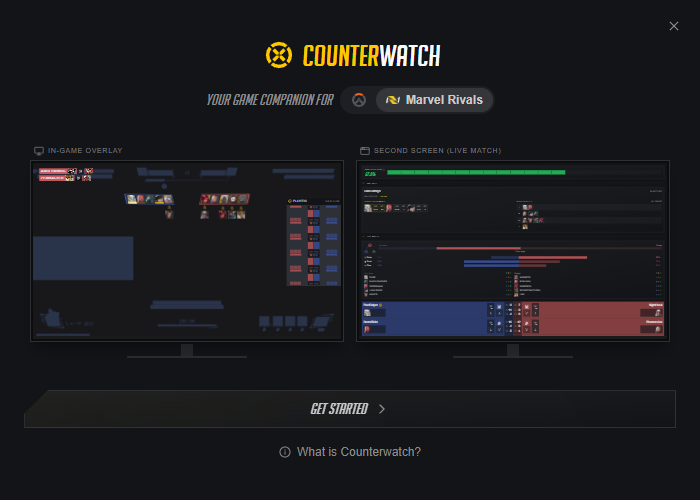 - Live App Preview: New users see an animated dual-monitor illustration showing the app's overlay and launcher working together, with hero swaps and live data previews for both Overwatch and Marvel Rivals